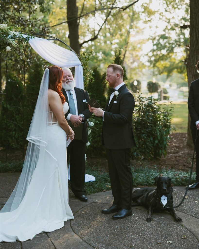 One unique highlight was the couple’s beloved dog, dressed in a tuxedo and lying obediently by their side throughout the ceremony. Including pets in weddings is a trend I love capturing, as it adds a layer of personality and heart to the day. This moment was a perfect example of how candid photography can tell a story as it unfolds, creating images that feel as authentic as the love shared.