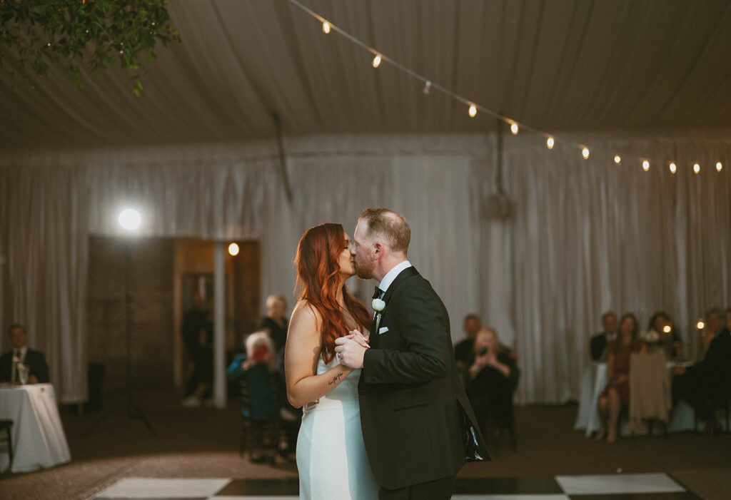After the ceremony, I worked with the couple to capture editorial-style portraits. With Riverwood Mansion’s stately façade in the background, the bride’s sleek, minimalist gown and the groom’s classic black tuxedo popped against the lush greenery. The bride’s fiery red hair added a striking contrast, which we incorporated into the shoot to highlight their bold, rock-and-roll aesthetic.