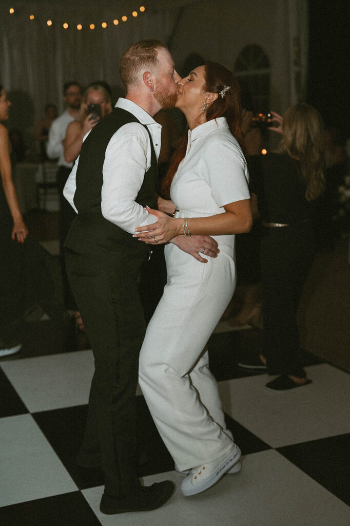 Inside Riverwood Mansion, the reception was an explosion of energy. The décor featured deep black accents paired with moody candlelight and metallic touches. Guests dined on locally sourced dishes before taking to the dance floor, where a playlist of classic rock hits kept the party going all night.
