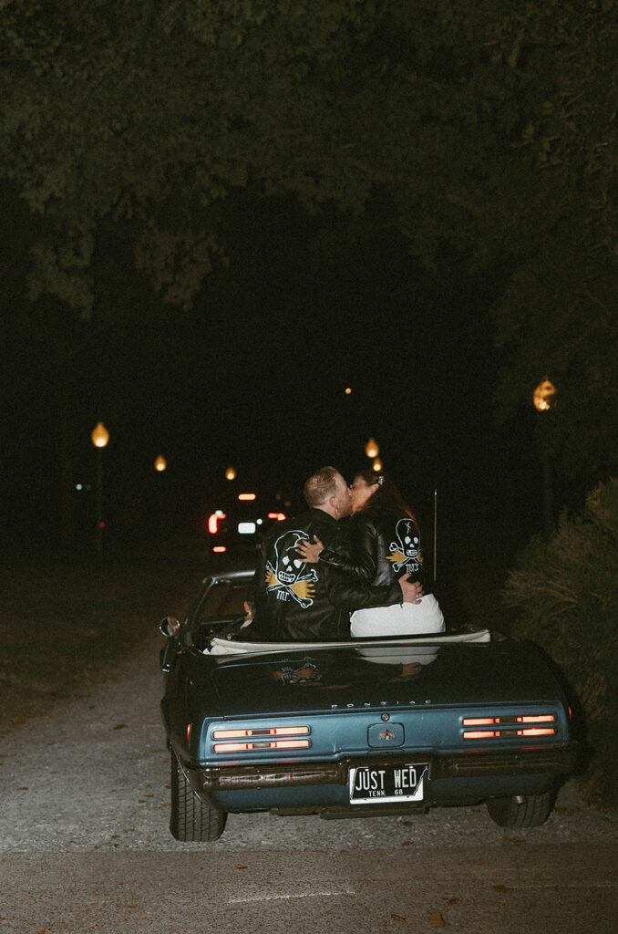 The custom leather jackets designed by Brandon Owens were another highlight of the portrait session. The couple wore these during their post-ceremony portraits, adding a rebellious and stylish edge to their timeless attire.